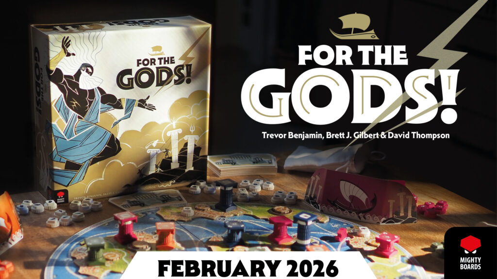 Once you receive the game and start playing – if you like For the Gods! -, please take moment to rate the game on BoardGameGeek or post a photo or video on social media, tagging Mighty Boards!